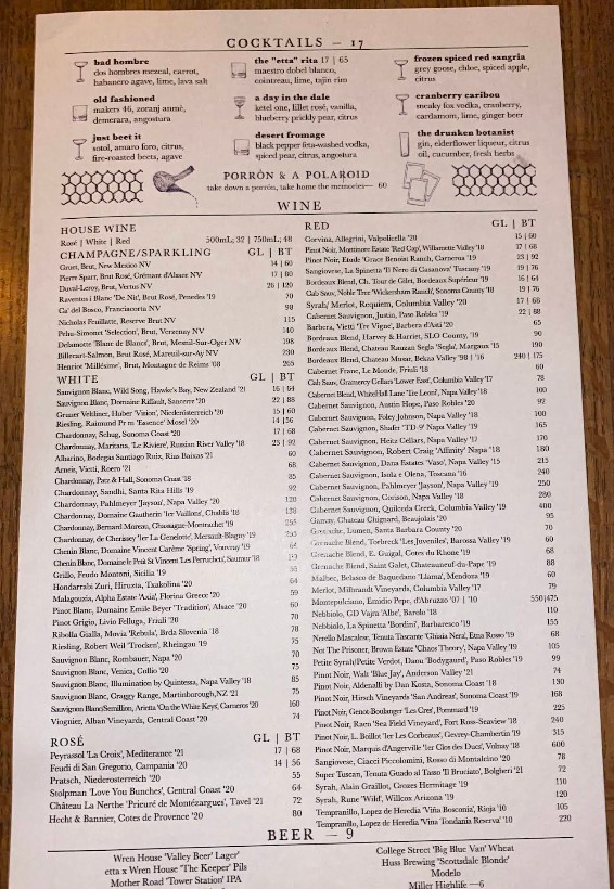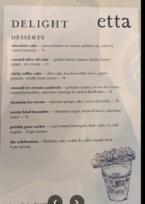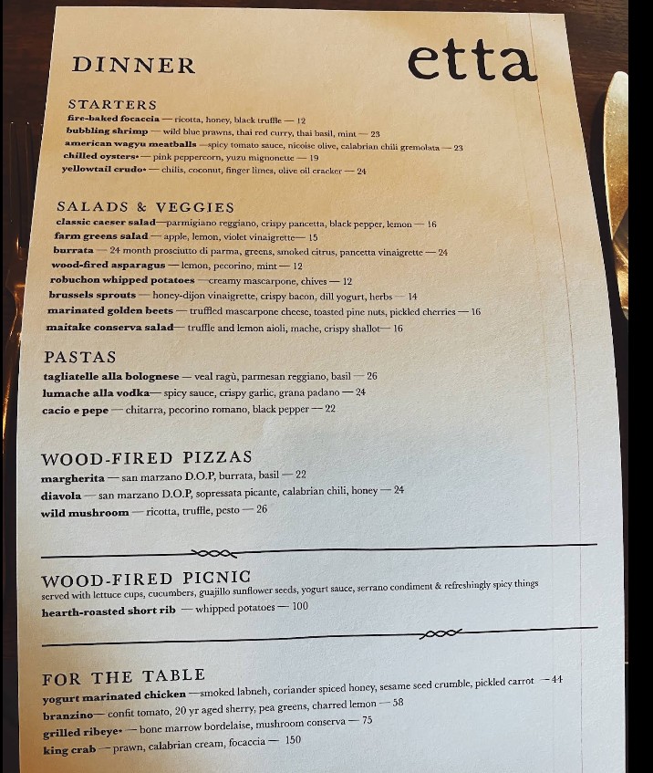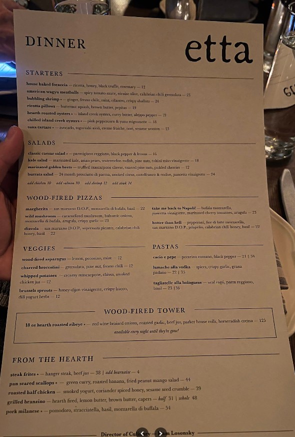 Stopped by Etta for dinner and loved it. We really wanted to sit in the dining room, but we arrived an hour early for our reservation and they sat us in a booth in the bar. It was nice though, the music was good. Had the gem salad, spicy rigatoni, hamachi crudo, and shrimp cocktail. All lovely. I checked the bar menu and had to order the chicken nuggies. They are elevated chick fil a nuggets. Crispy goodness. Dessert was the lemon tart. I don’t live in AZ, but will have try to come back for the dining area vibes.